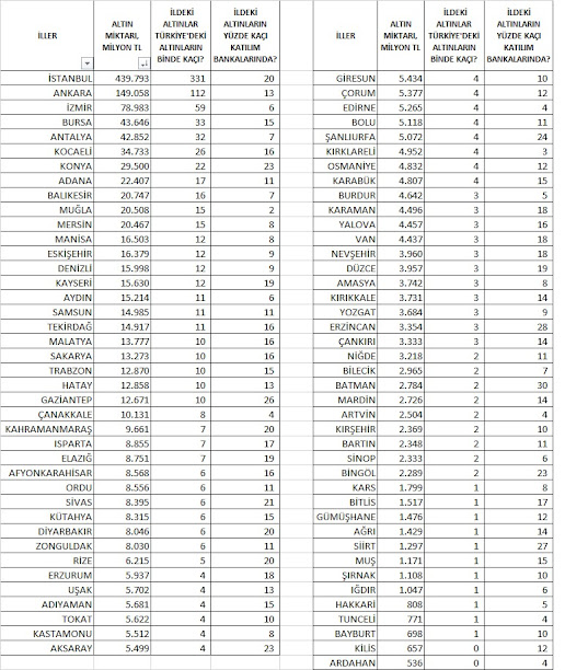 Türkiye'deki bankalardaki altınların illere göre dağılımını aşağıdaki tabloda görebilirsiniz.